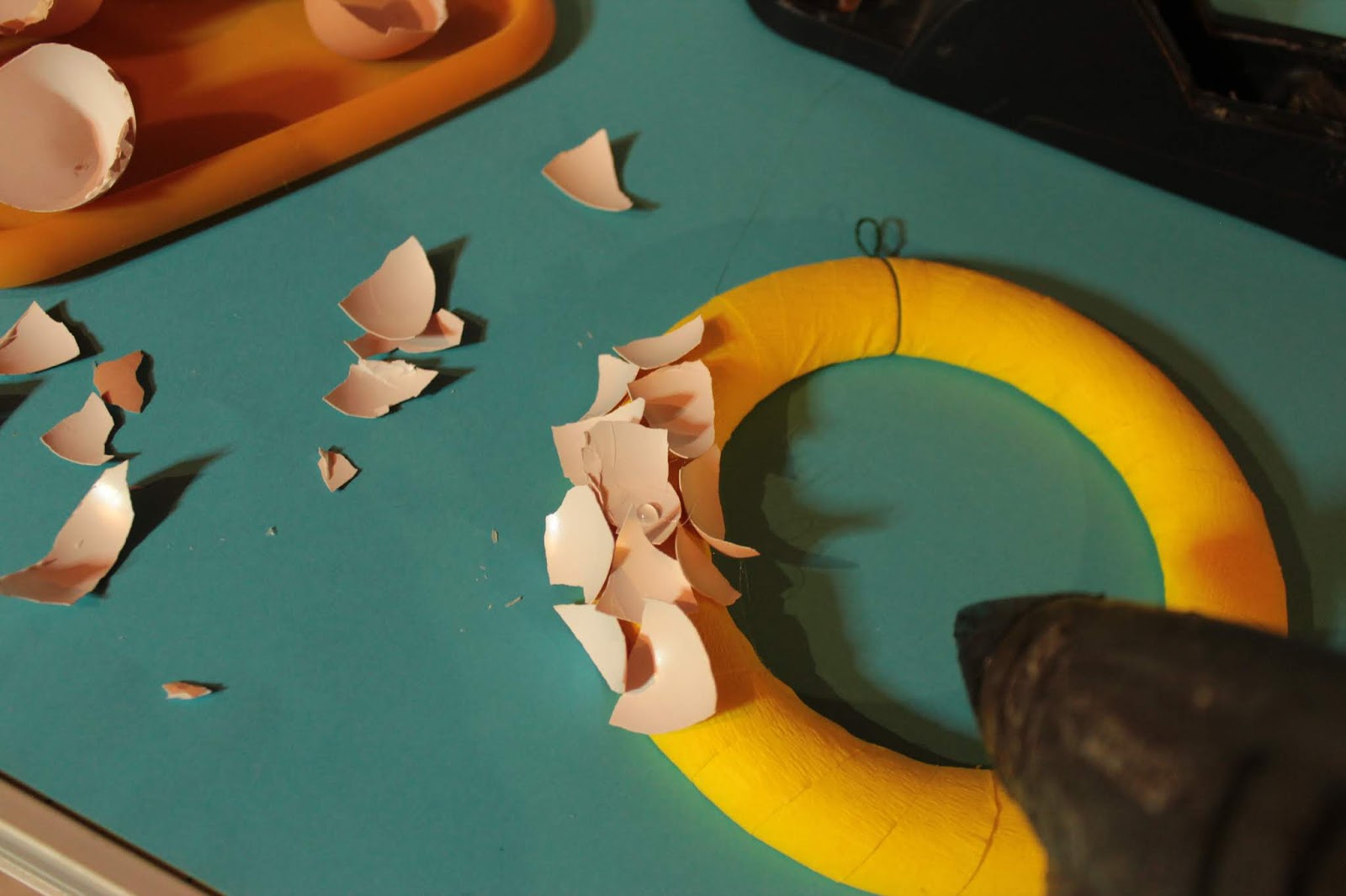 A héjakat nem túl apróra eltördeled, és belsejével kifelé az alapra ragasztod.